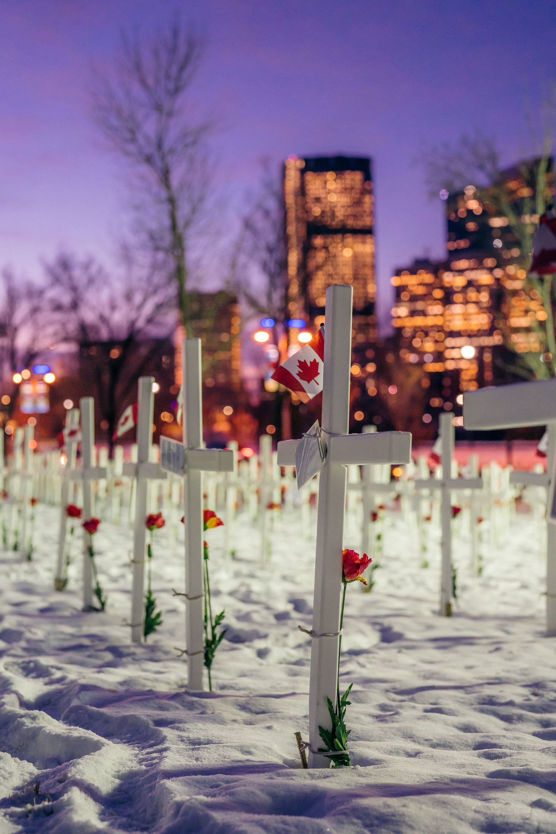 Remembrance Day services are held throughout the province, such as the Field of Crosses along Memorial Drive in Calgary.