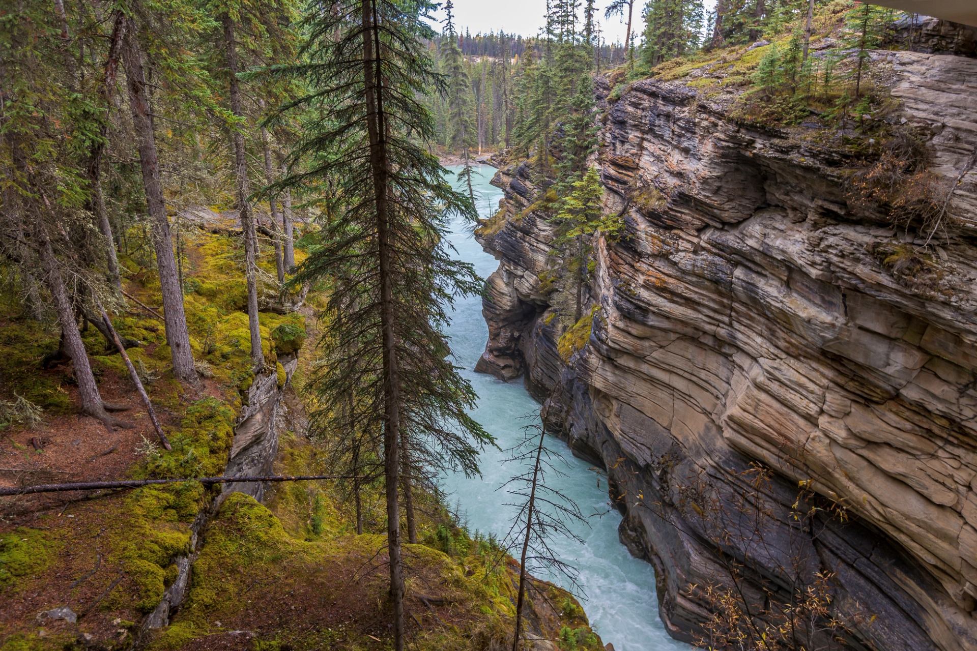Athabasca Falls may not be the tallest waterfall in the Canadian Rockies, but iti delivers on power and drama. Plus, the falls are easy to access since they're just off the Icefields Parkway 30 km (19 mi) south of the Jasper townsite. At Athabasca Falls, the water plunges 24 m (79 ft) as the Athabasca River flows away from its source at the Columbia Icefield. The sheer volume of water and the noise it produces is truly impressive. The falls have cut into the limestone of the basin, creating features like potholes and a short canyon. Several platforms and walkways mean you can safely view and photograph Athabasca Falls. Be sure to stay behind the railings, as mist from the falls can make the surrounding rock slippery. There is plenty of free parking and the falls are a short stroll from the lot.
