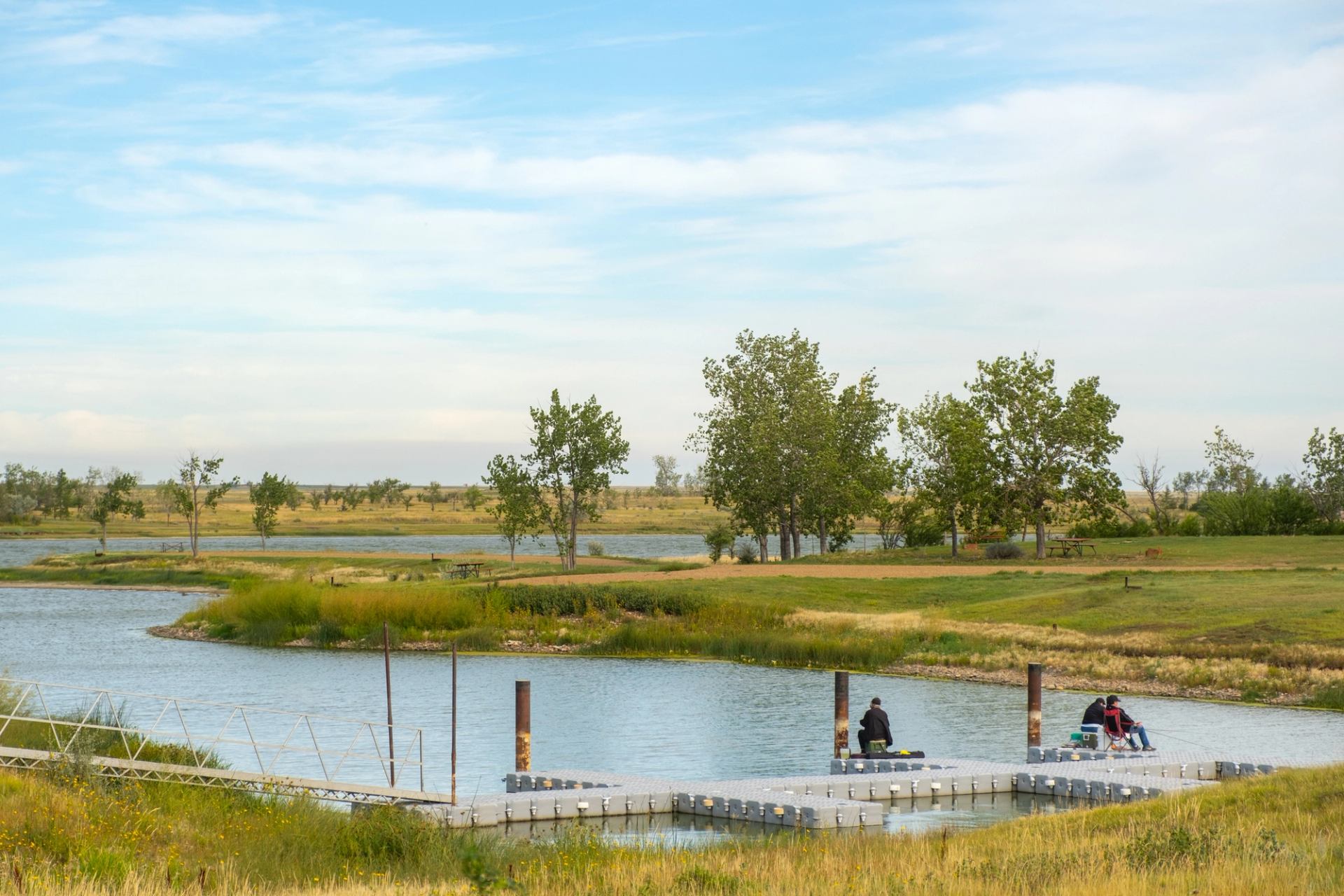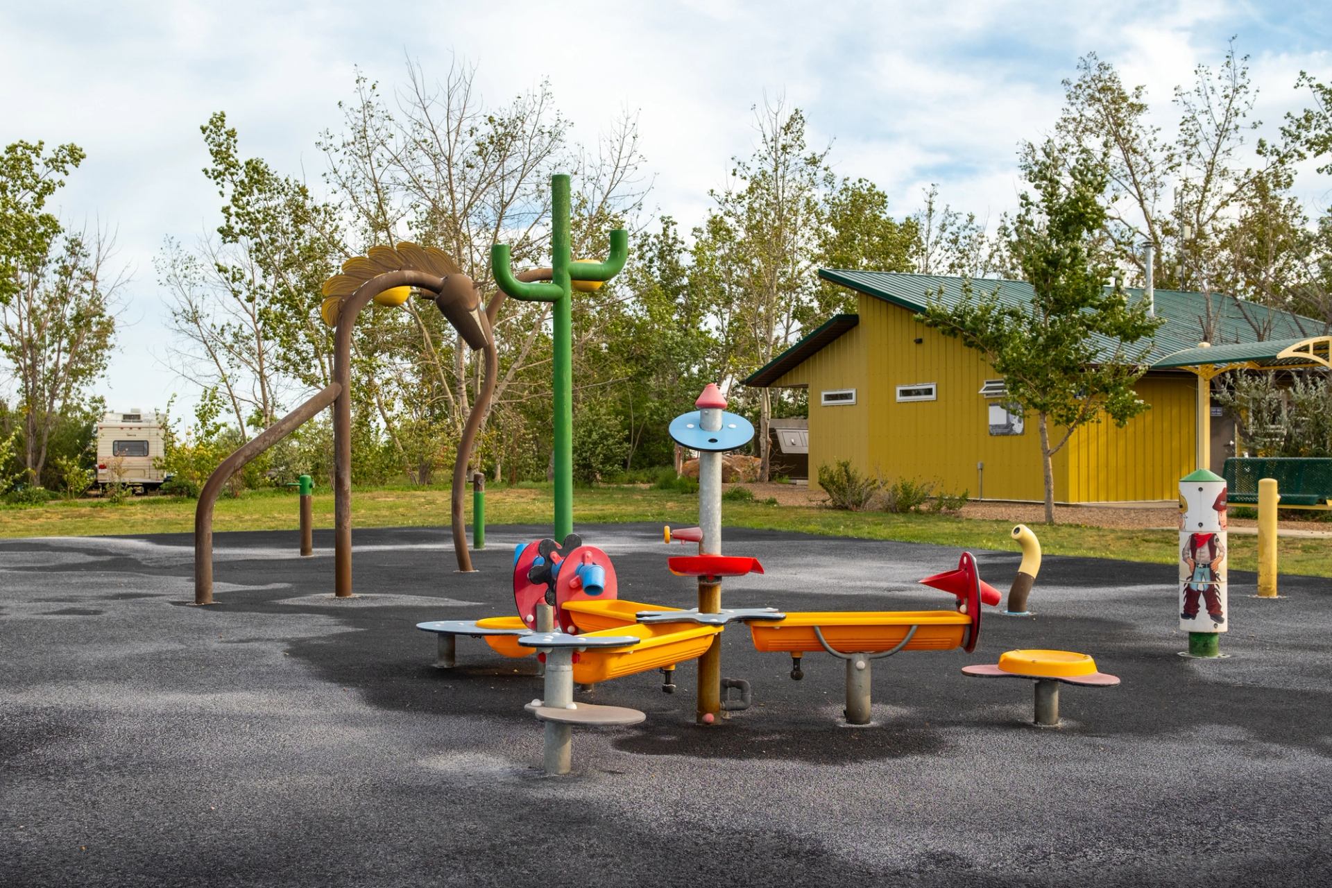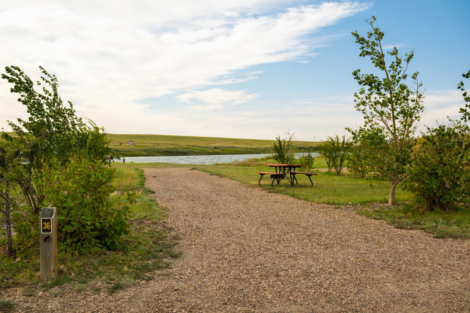 Blood Indian Park is a campground about 130 km (80 mi) east of Drumheller and an excellent base for exploring Alberta’s grasslands. The campground has 37 serviced sites, plus another 300 "random" sites along the shoreline of Blood Indian Creek Reservoir. The term “random” means these unserviced sites are first-come, first-served. Visitors will find a beach, a ball diamond, horseshoe pits, and a day-use area, and kids can enjoy the spray park, playground. Blood Indian Park is open year-round. From May to September, it has potable water and a store that stocks essentials. Power boats are allowed but must maintain strict speed limits, which keeps the water ideal for swimmers, paddlers and anglers. The latter can fish from the shore or floating docks. The reservoir is stocked with over 175,000 fingerling trout annually. Trails through the grasslands offer hiking and birdwatching possibilities.