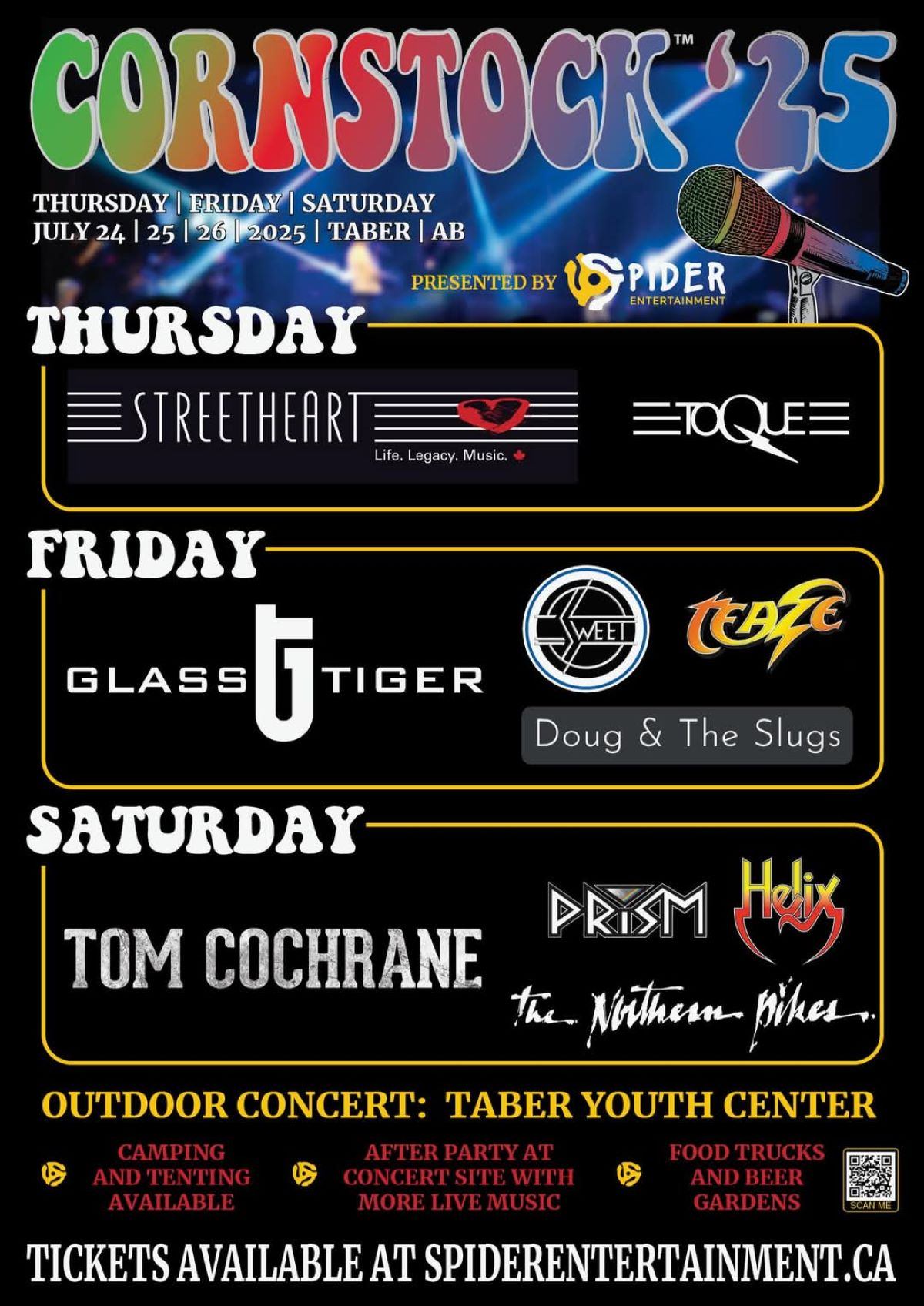 Come watch some of the greatest classic rock acts in Canada at Spider Entertainment's 3-day classic Rock Festival in Southern Alberta (TABER, AB to be exact)! This show involves internationally recognized artists that are truly Canadian Classic Rock ROYALTY, Great American Icons, as well as showcasing local bands from Southern Alberta. Amenities at this all-ages event include food trucks, beer tents raising funds for the local not-for-profit Taber Titans Charity, a 50/50 booth raising funds for the Taber Food Bank, and more. Enjoy a weekend filled with camping, food, and an incredible lineup of artists that will make this weekend the highlight of your summer!