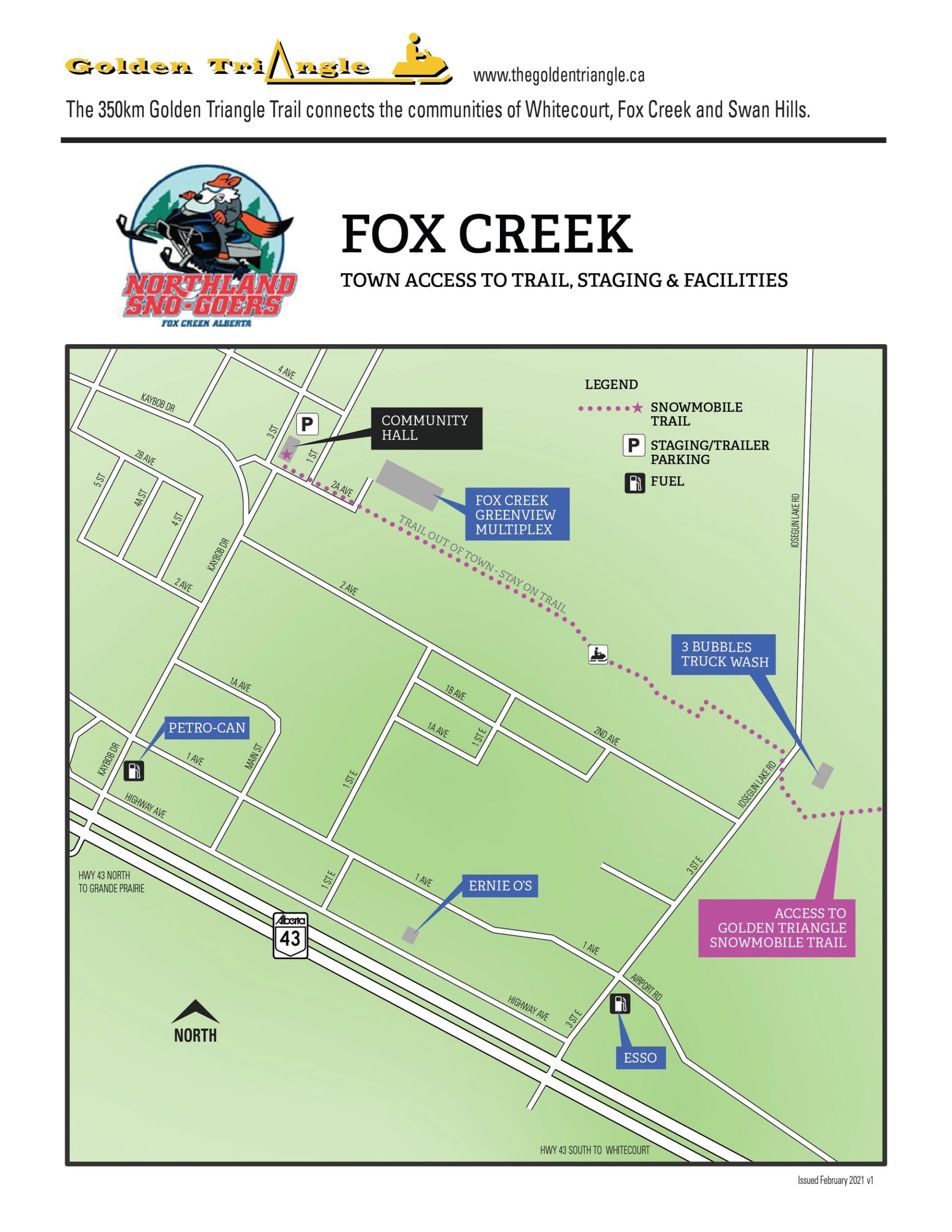The Fox Creek snowmobile trail system connects with its Golden Triangle sled trail partners - Whitecourt and Swan Hills to form a 350km loop trail system that connects the 3 towns of Fox Creek, Whitecourt, and Swan Hills with the counties of MD of Greenview, Big Lakes, and Woodlands. Fox Creek Northland Sno-Goers Club has an additional 125 km of maintained and groomed trails for sledding enthusiasts of all types - ages, and skills. Great signage on the trails. 3 Warm-Up shelters. Staging in town. Amazing scenery with views, foliage, wildlife, and pure backcountry experiences and adventures. Many hills, and a variety of terrain on the entire system. When planning your trip on the trails, remember you are in the backcountry, so having extra fuel, safety packs, and food are essential. The trails are managed - cleaned, groomed, and signed by the Fox Creek Northland Sno-Goers Club. Hotels, gas, food, and other amenities are available. Spectacular award-winning snowmobile trails!! Come and play. Be sure to check in with the Club as to the status and updates of their trails.