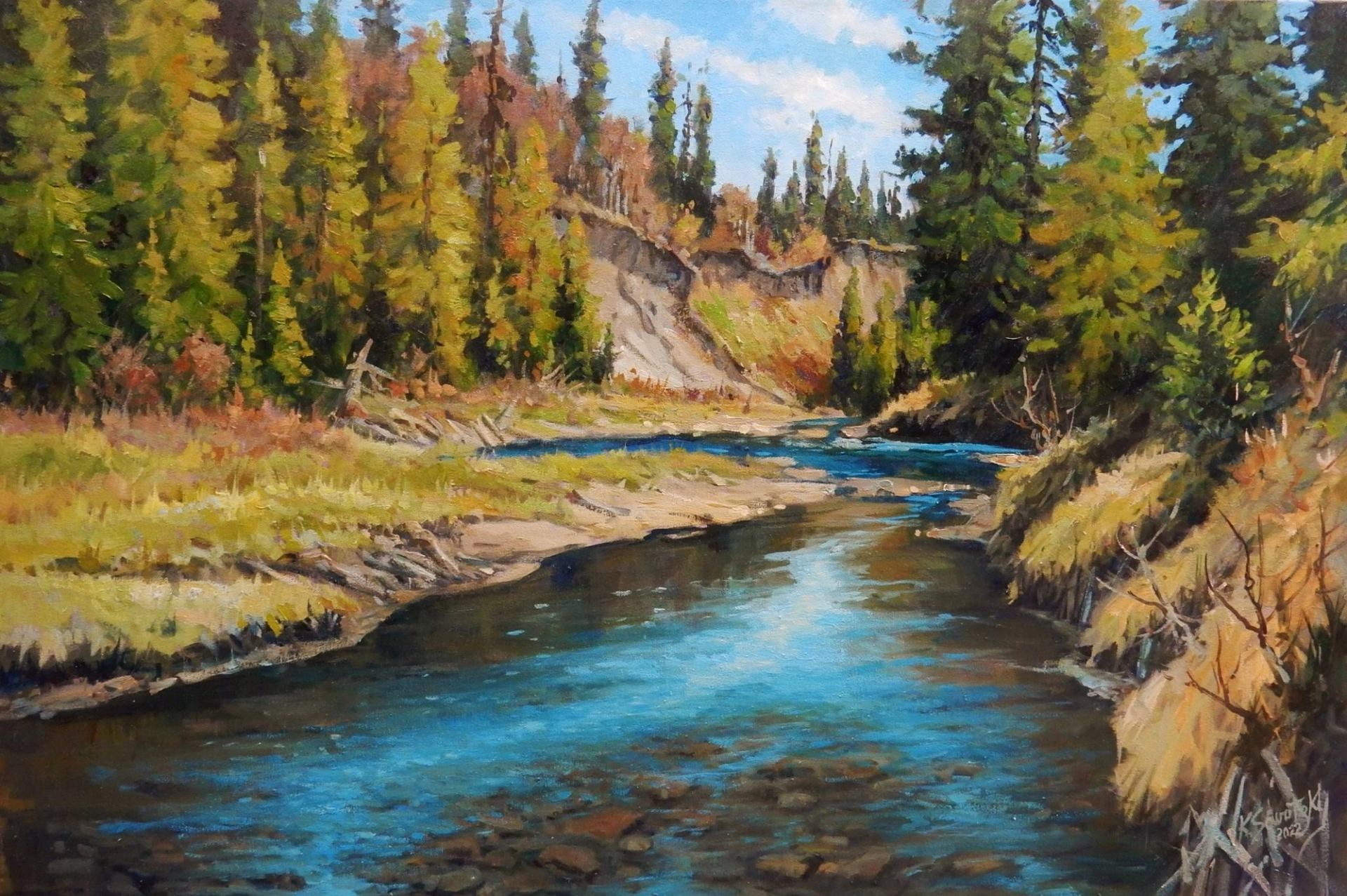 Kelvin Sawatzky is a Saskatchewan-born landscape and portrait artist who first began visiting and painting the Fort McMurray area in 1978 and made it his full-time home in 1985. He works mostly in oils and many of his canvases feature the lakes, rivers, and forests of the region. His work has been exhibited in numerous individual and group shows and is represented in collections, both private and public, throughout the world. You can view his paintings at his studio at the River City Centre.