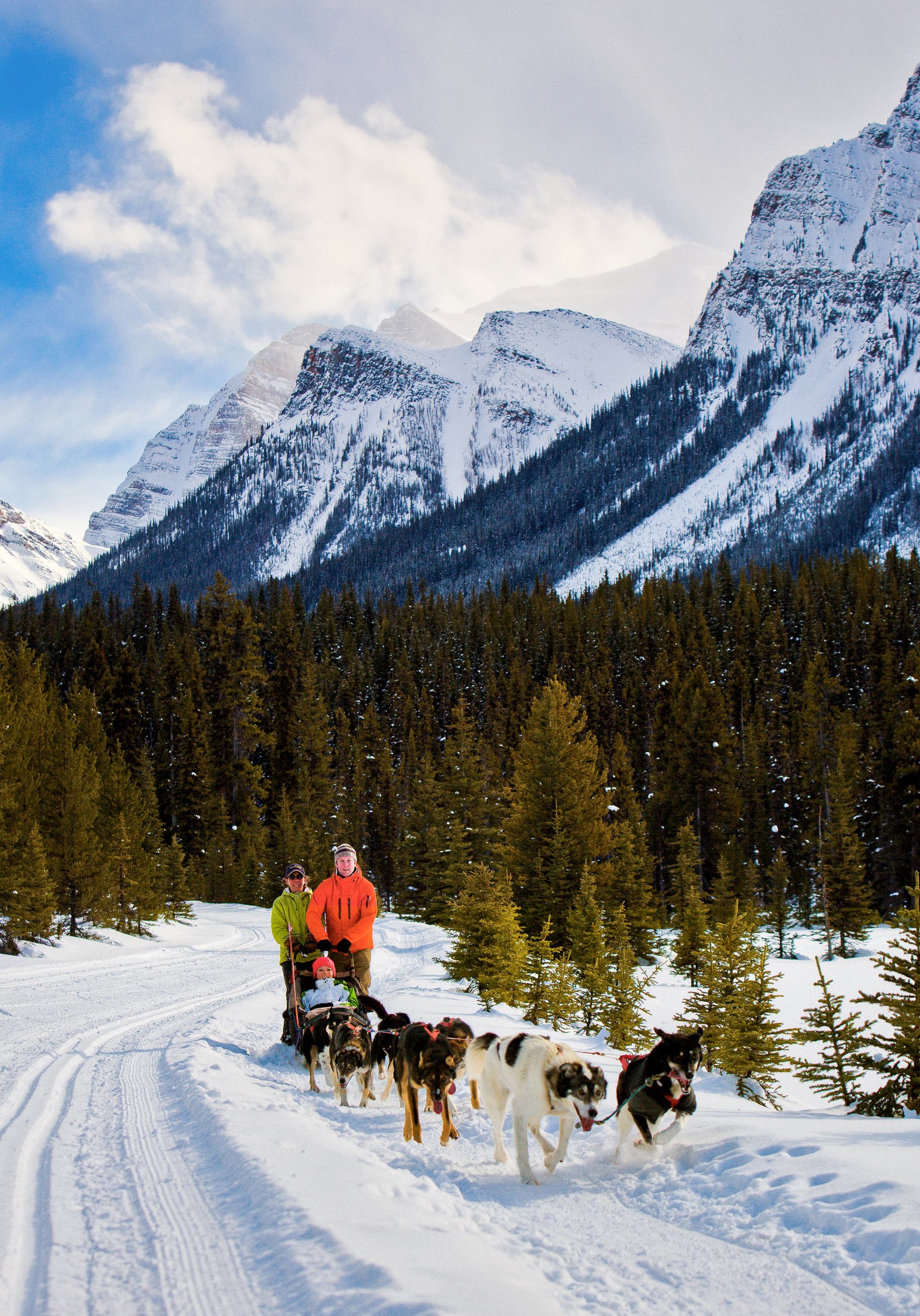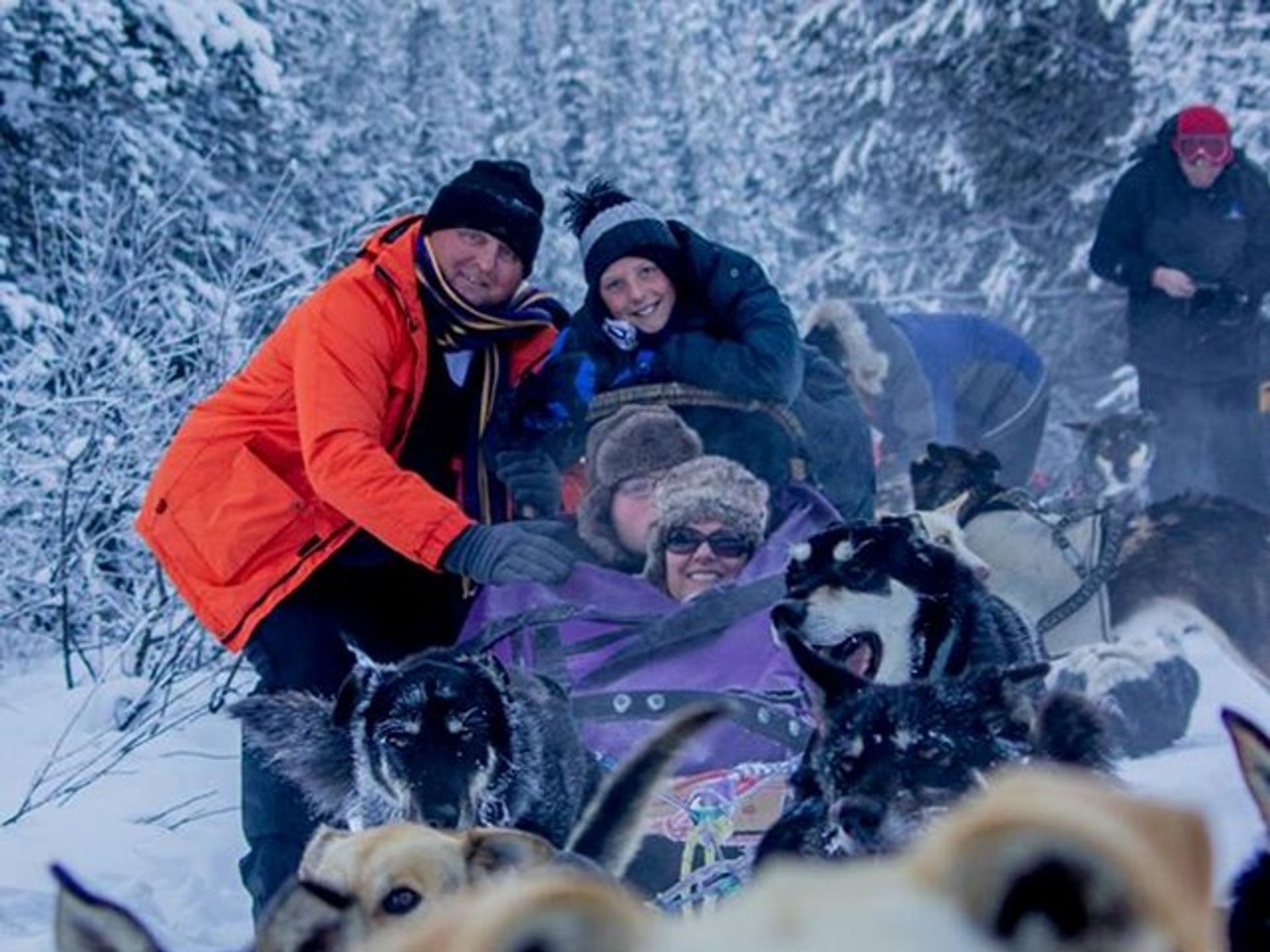 Kingmik Dog Sled Tours! The only company in the Bow Valley to offer tours in Banff National Park. The trails travel through the stunning landscape of Lake Louise, home of Moraine Lake and the iconic Chateau Lake Louise. They are 45 minutes from Banff, and their staging area is across the valley from Lake Louise Ski Resort. With some of the highest mountains clustered in and around the area, you will have the opportunity to view towering peaks and blue-white glaciers from the comfort of your cozy sled. They offer a full 10 mile tour (1.5 hour) to the Continental Divide and back, as well as a short ½ hour tour for those who would prefer just a taster. They are a small company, focusing on guest experience and dog care. All their dogs are cherished individuals and beloved members of their family. They strive to ensure that each dog is living it's best life, and their elders are as loved as the pups. Their guest-to-guide ratio is 2:1. They do not seat strangers together. While every sled is guided, there is the opportunity to drive the team alongside your guide for part of your Divide Tour. They run, on average, only 4 sleds per tour time. All the guides are dedicated adventure seekers who relish the opportunity to share their life stories with you. Guests can expect to finish their tour with an incredible lifelong memory... new knowledge of the sled dog world as a whole, as well as acquiring a whole bunch of new four- legged friends.