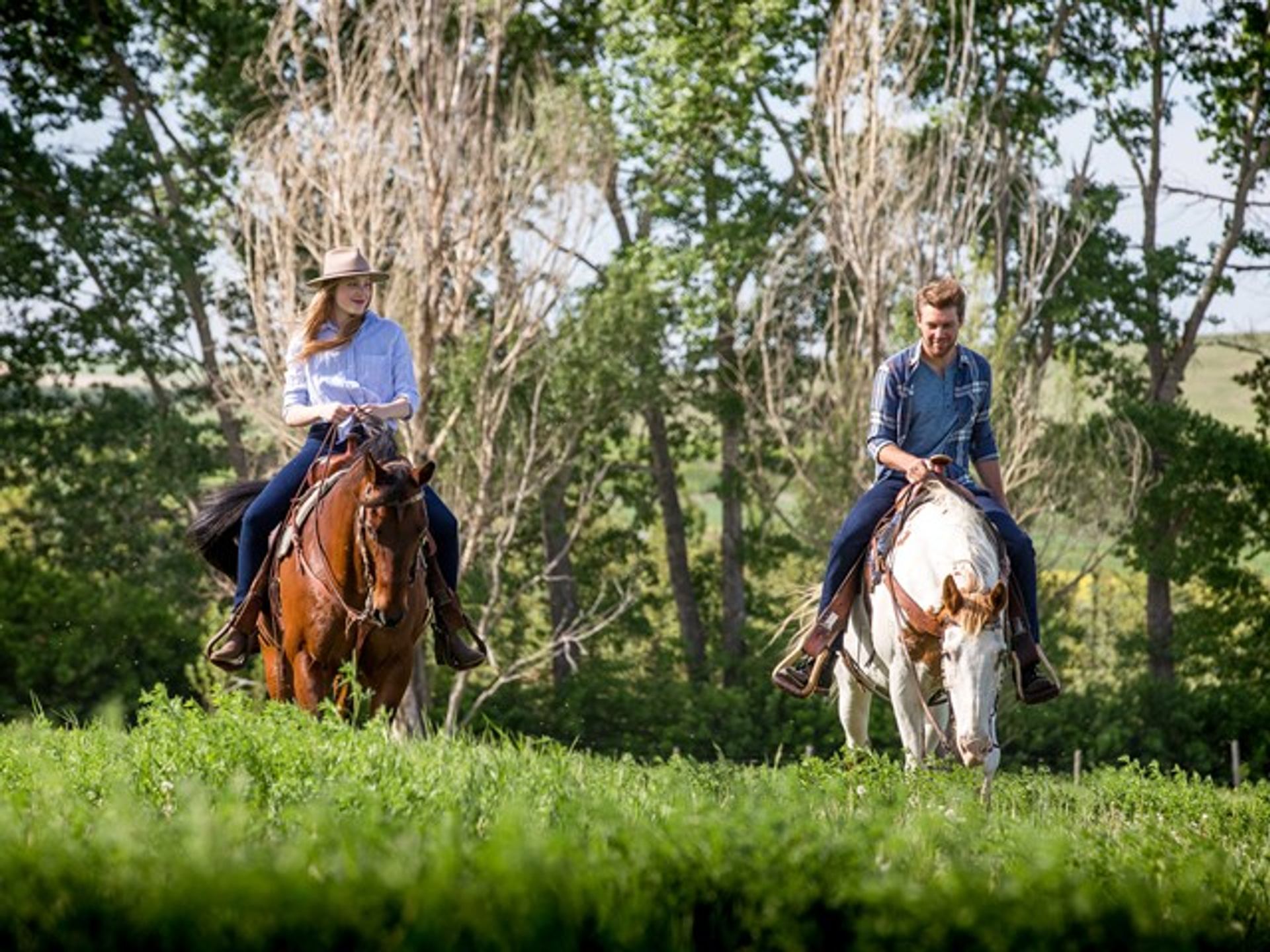 The Rocking R Guest House offers a little luxury on the prairie, 14 km (8 mi) southeast of Strathmore in central Alberta. Book the Bunk House or the Hitch’n Post, and then get ready for adventure. The Bunk House has two bedrooms and is great for families or small groups. The Hitch’n Post is a cozy and charming one-bedroom cabin ideal for romantic getaways. Both cabins have fully equipped kitchens and private decks. The Rocking R offers several packages that can add adventure or luxury to your stay. Those who want to get in the action can try horseback riding. If you’re more interested in taking it easy, you can take advantage of the in-cabin dining options and have your meals delivered to your door. The Heartland package lets fans of the show hone their riding skills and visit filming sites in the town of High River.