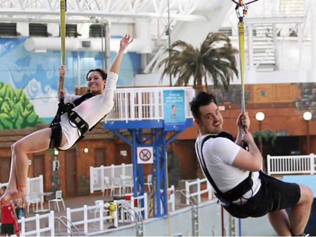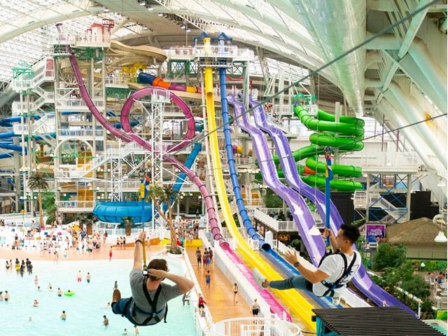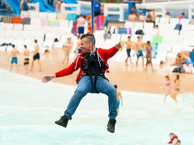 Soar across the waves at speeds of up to 40 kph on the SkyFlyer Zipline. The 470-foot indoor zipline crosses over the entire wave pool, giving you an unparalleled view of World Waterpark. Groups of up to four people can share the experience by riding side-by-side on parallel lines.