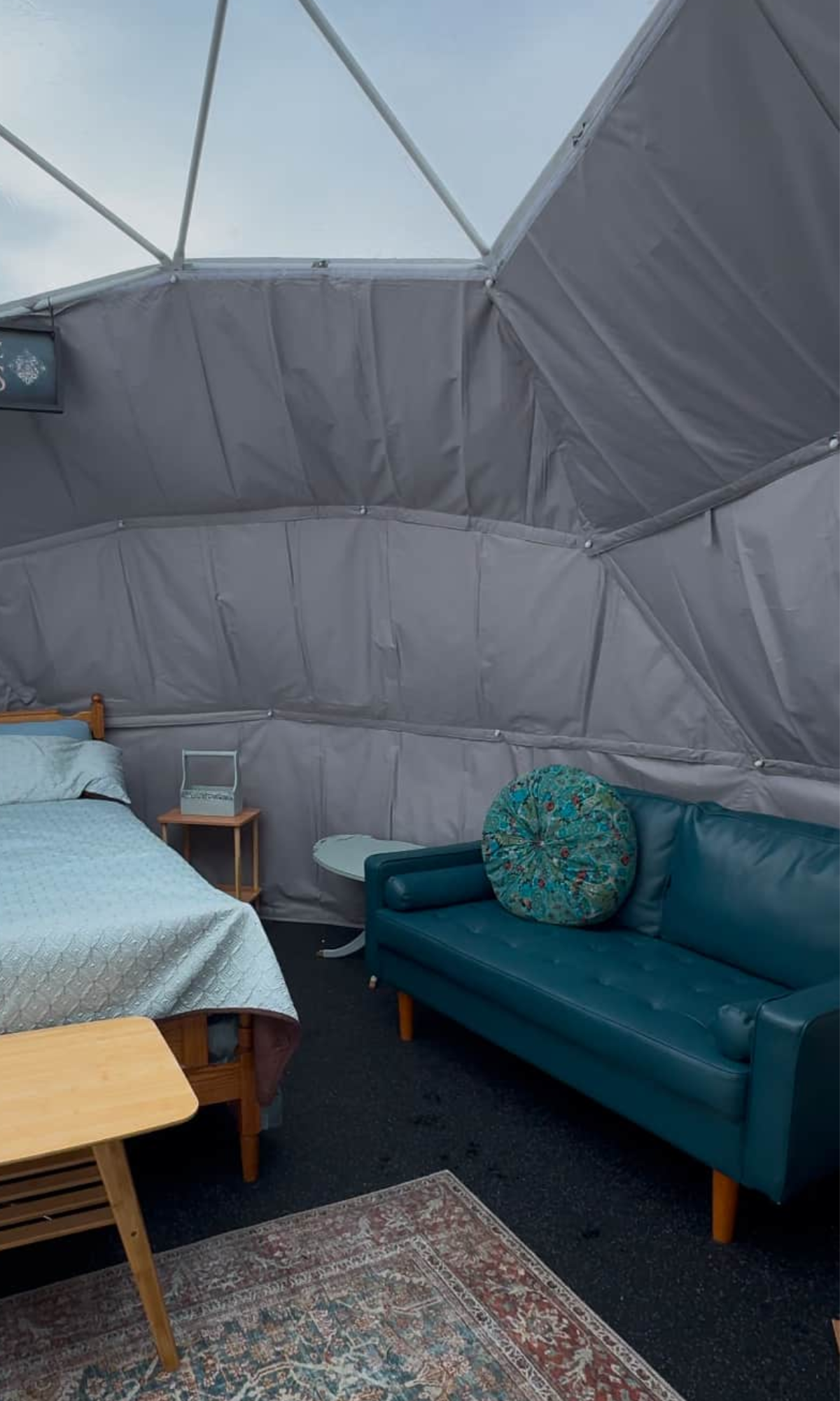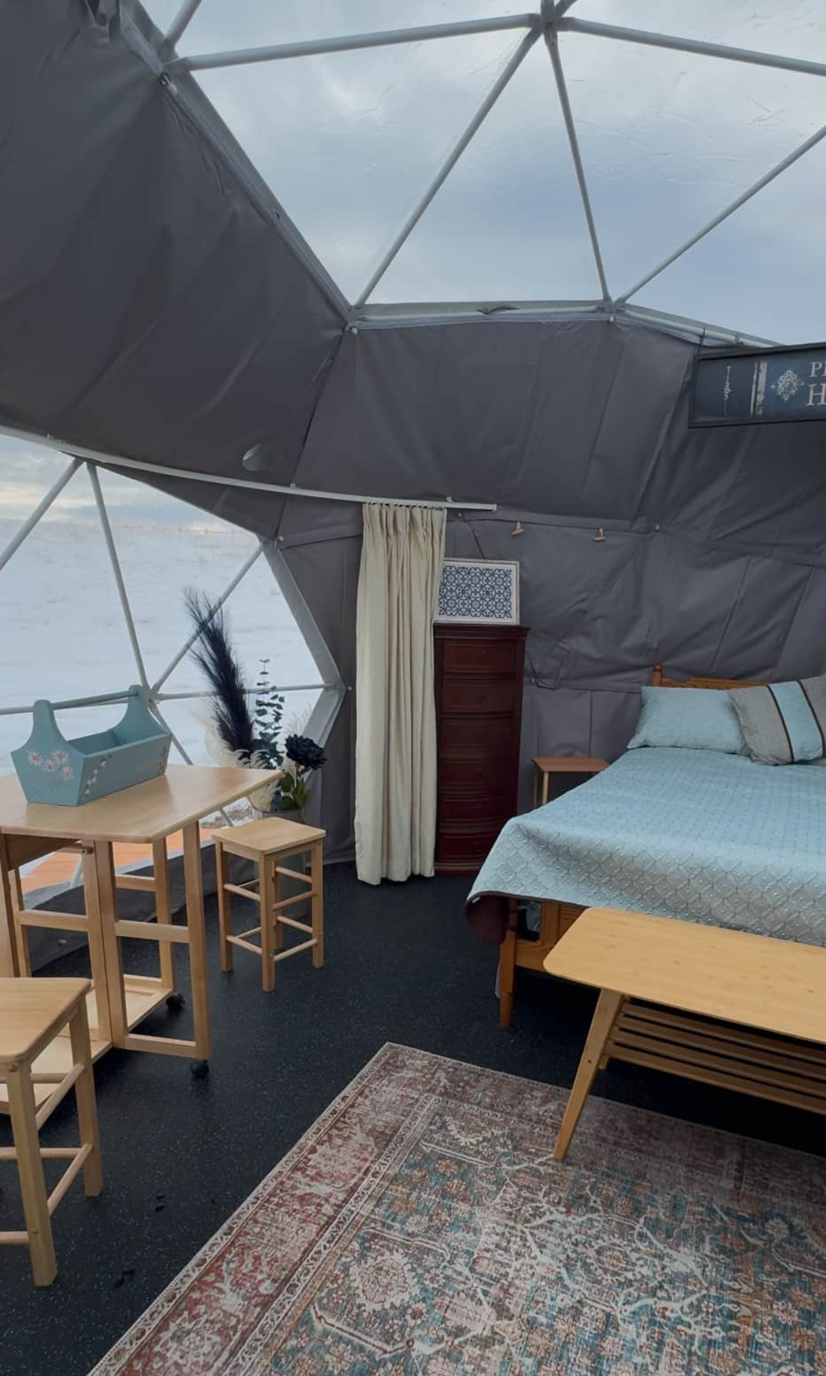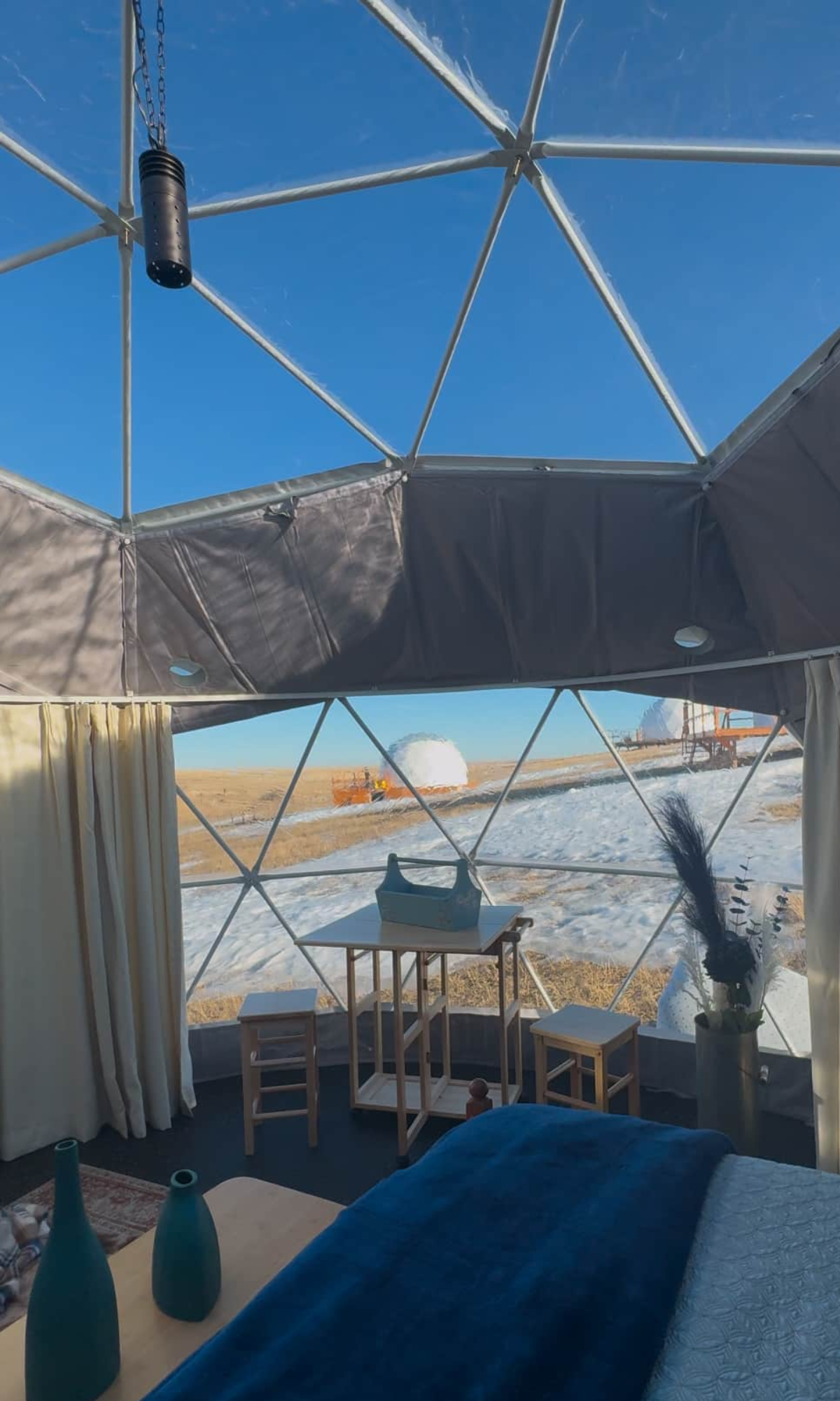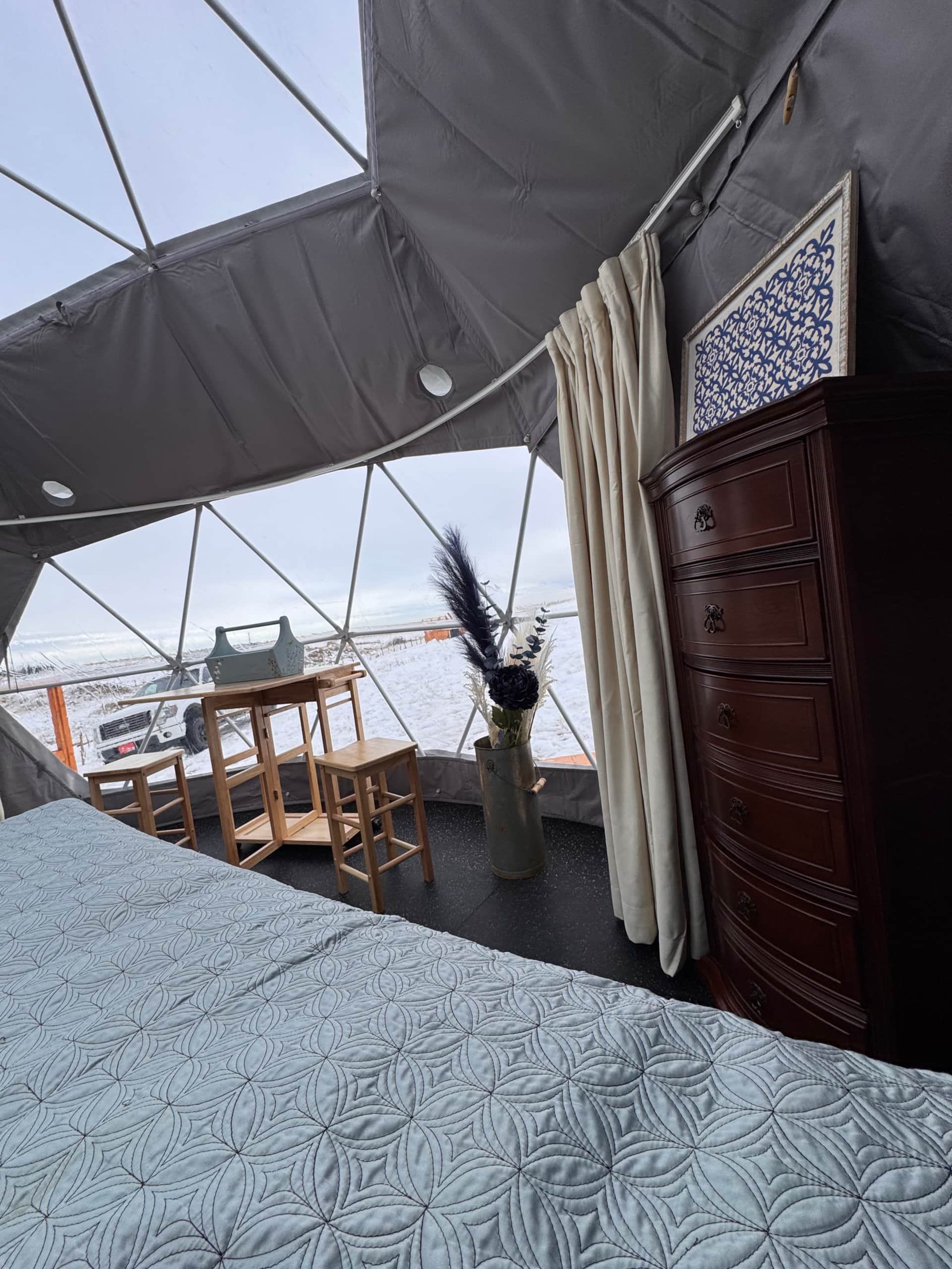 The Chinook Breeze Dome captures the essence of the prairie sky, with hues of blue that evoke calm and renewal. This dome is perfect for unwinding and recharging, offering a serene space that mirrors the gentle warmth of a Chinook wind. Furnished with a queen bed, cozy seating, and a small table, it’s designed for comfort and connection. Featuring a heater, lights, and phone charger, the Chinook Breeze Dome ensures a cozy, modern stay. Though this is glamping, the experience still embraces the spirit of camping—you’ll take a short walk to the bathroom amenities, grounding yourself in the beauty of the land. Surrounded by the vast prairie skies, the Chinook Breeze Dome is a peaceful retreat where the wide-open landscapes invite you to relax and just be.