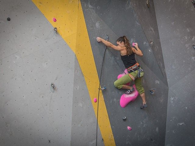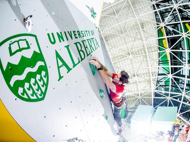 Located on the University of Alberta's North Campus, the Wilson Climbing Centre is a modern climbing structure designed for those with a passion for climbing. The student and community facility features a 2,700-square-foot bouldering area with over 40 boulder problems ranging from v0- to v10. There are over 7,000 square feet of high wall climbing to a maximum height of 48 feet and up to 60 feet of linear climbing, with ice 50 high wall routes graded 5.6 to 5.14. There are also 19 top roping anchors and 16 lead climbing anchors.